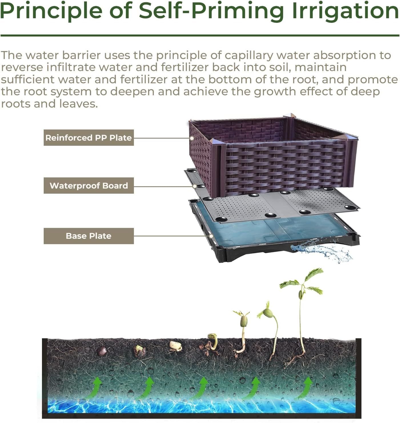 [Irrigation System]The plant growth box is designed with an irrigation system, including water storage and drainage hole functions, which not only provide a space to store excess water, but also help plants fully absorb water and nutrients.
